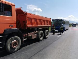 „Cu puțin timp în urmă a avut loc un accident de circulație pe strada Bisericii Române din localitatea Ghimbav, în care au fost implicate un autobuz și o autoutilitară.