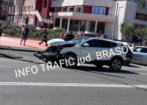 Accident într-o intersecție din Brașov! Două autovehicule au intrat în coliziune, în această după-amiază, la intersecția str. Tâmpei cu Bulevardul Valea Cetății. În urma coliziunii, una dintre mașini a ieșit în afara șoselei.
