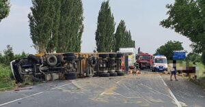 Centrul INFOTRAFIC din Inspectoratul General al Poliţiei Române informează că pe DN 2 Focșani-Adjud, la kilometrul 186+500 de metri, la ieșire din municipiul Focșani, județul Vrancea, unui autocamion încărcat cu lemne i-a explodat pneul, a acroșat un autoturism și, ulterior, s-a răsturnat pe carosabil, blocând ambele sensuri de mers.
