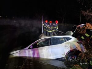 Autoturism scufundat într-un lac din județul Brașov! Pompierii au intervenit în această noapte pentru aducerea mașinii la mal. În interior nu se afla nicio persoană.