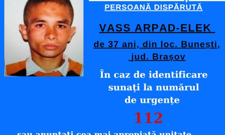„Polițiștii din cadrul Inspectoratului de Poliție Județean Brașov efectuează verificări pentru identificarea unei persoane dispărute, după ce au fost sesizați în cursul zilei de 31 octombrie cu privire la faptul că, VASS ARPAD-ELEK, în vârstă de 37 de ani, a plecat voluntar la data de 27 octombrie, de la domiciliul său, din comuna Bunești, fără a se cunoaște destinația și fără a mai reveni până în prezent.