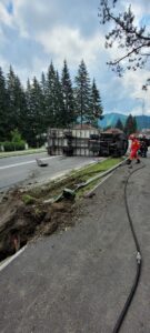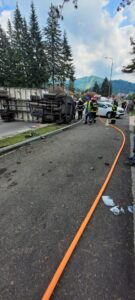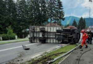 „Accident rutier în Predeal, str. Mihail Săulescu (n.r. DN 1) – autoutilitară răsturnată, care transporta produse alimentare. La fața locului s-au deplasat o autospecială de stingere și un echipaj SMURD. Cele două persoane care se aflau în autoutilitară au fost evaluate medical la fața locului și au refuzat transportul la spital. Se asigură măsurile necesare de prevenire și stingere a incendiilor”, a anunțat purtătorul de cuvânt al ISU Brașov, mr. Ciprian Sfreja.