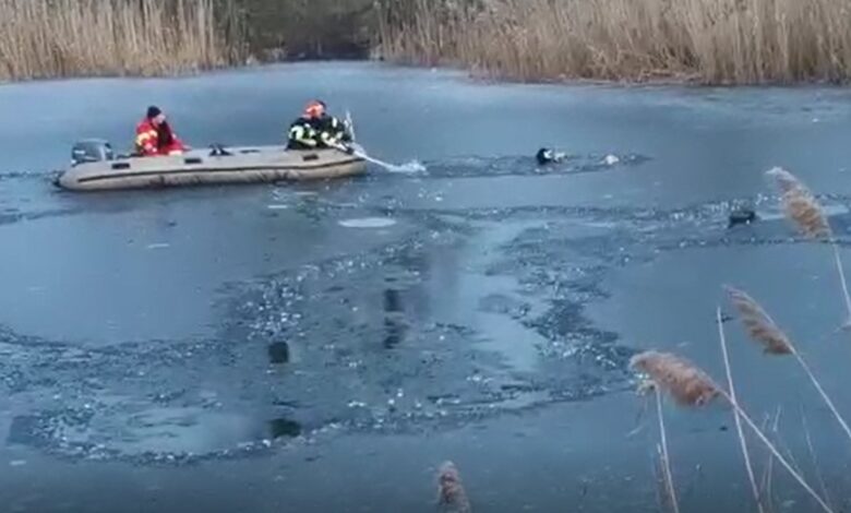 Câini salvați din lacul înghețat. S-a întâmplat sâmbătă după-amiază, la Făgăraș. ISU Brașov a fost anunțat că trei câini riscă să se înece în lacul din localitate. Animalele se zbăteau neputincioase, captive în gheața de pe luciul apei.