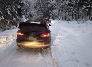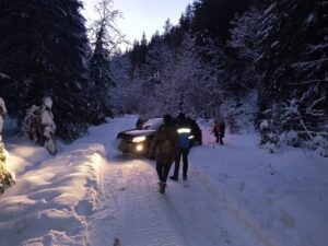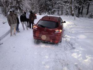 Foto – Turiști înzăpeziți cu mașinile pe un drum forestier din Predeal, din cauza unei aplicații, ajutați de jandarmii brașoveni