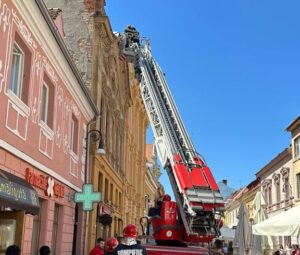 „Am fost solicitați să intervenim pentru îndepărtarea unor elemente de construcție de pe o clădire situată pe strada Republicii nr. 16, Brașov.