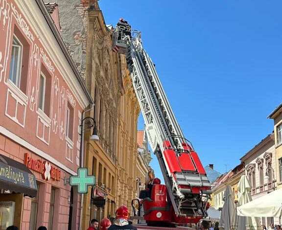 Echipaje ale ISU Brașov au intervenit astăzi pe strada Republicii din Brașov, pentru a îndepărta elemente de construcție de pe o clădire, întrucât exista riscul de a răni trecători.