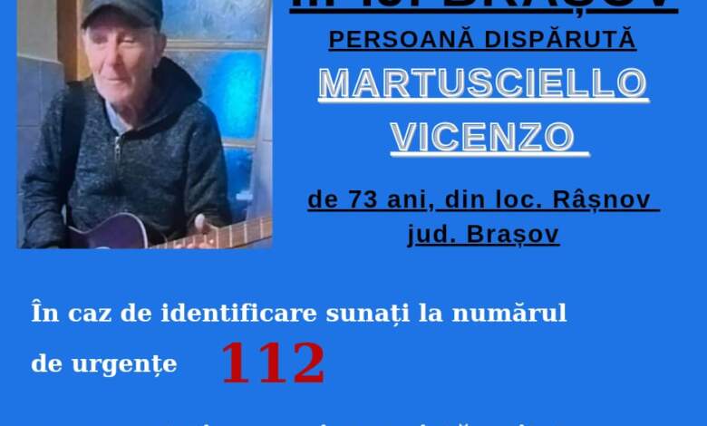 „Polițiștii din cadrul Inspectoratului de Poliție Județean Brașov efectuează verificări pentru identificarea unei persoane dispărute, după ce au fost sesizați cu privire la faptul că MARTUSCIELLO VICENZO, cetățean italian, în vârstă de 73 de ani, ar fi plecat voluntar de la domiciliul, din localitatea Râșnov, jud. Brașov, fără a se cunoaște destinația și fără a mai reveni până în prezent.