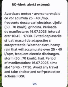 Weather alert, heavy rain that will accumulate over 25 – 40 l/sqm, frequent electric discharges, storm (50…70 km/h), hail. Period of manifestation: 16.07.2025, time slot 16:45 – 17:30. Avoid any travel and take shelter and self-protection actions! IGSU.