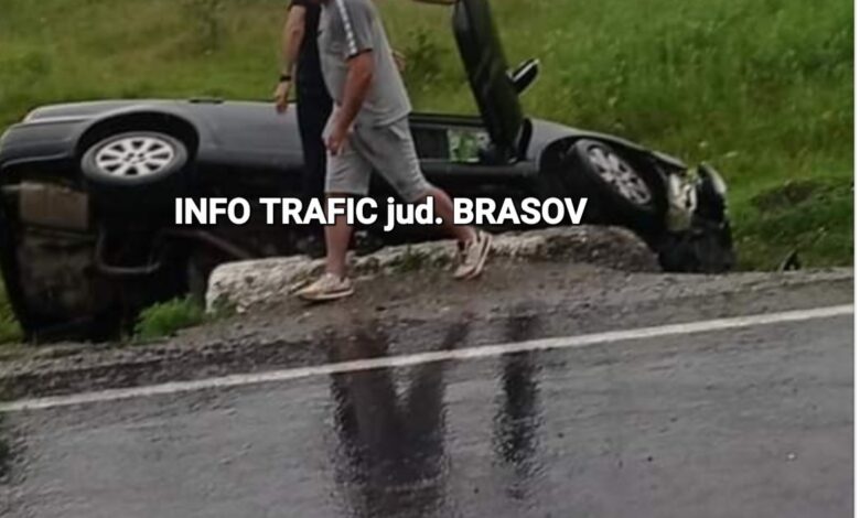 „Accident rutier în localitatea Perșani, mașină răsturnată în afara părții carosabile.