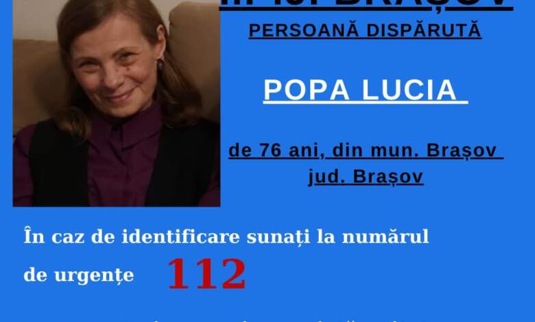 „Polițiștii din cadrul Inspectoratului de Poliție Județean Brașov efectuează verificări pentru identificarea unei persoane dispărute, după ce au fost sesizați cu privire la faptul că, POPA LUCIA, în vârstă de 76 de ani, a plecat voluntar de la domiciliul, din municipiul Brașov, jud. Brașov, fără a se cunoaște destinația și fără a mai reveni până în prezent.