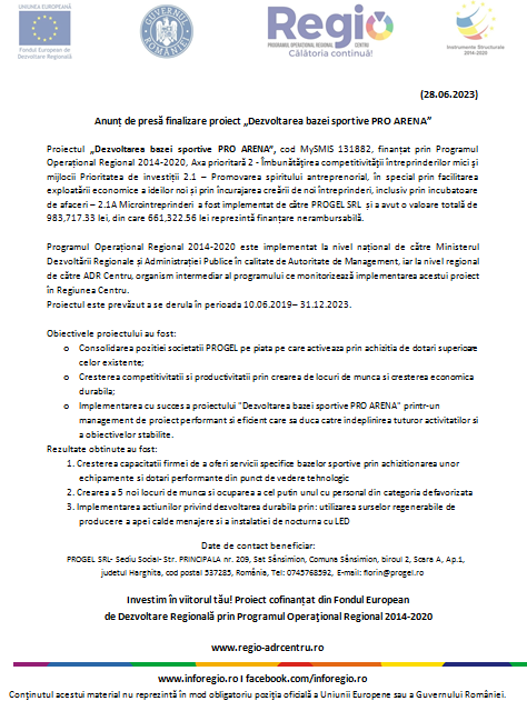 Proiectul „Dezvoltarea bazei sportive PRO ARENA”, cod MySMIS 131882, finanțat prin Programul Operațional Regional 2014-2020, Axa prioritară 2 – Îmbunătăţirea competitivităţii întreprinderilor mici şi mijlocii Prioritatea de investiții 2.1 – Promovarea spiritului antreprenorial, în special prin facilitarea exploatării economice a ideilor noi și prin încurajarea creării de noi întreprinderi, inclusiv prin incubatoare de afaceri – 2.1A Microintreprinderi a fost implementat de către PROGEL SRL și a avut o valoare totală de 983,717.33 lei, din care 661,322.56 lei reprezintă finanțare nerambursabilă.