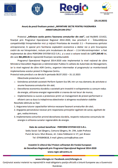 Proiectul „Infiintare sectie pentru fasonarea armaturilor din otel”, cod MySMIS 131422, finanțat prin Programul Operațional Regional 2014-2020, Axa prioritară 2 – Îmbunătăţirea competitivităţii întreprinderilor mici şi mijlocii Prioritatea de investiții 2.1 – Promovarea spiritului antreprenorial, în special prin facilitarea exploatării economice a ideilor noi și prin încurajarea creării de noi întreprinderi, inclusiv prin incubatoare de afaceri – 2.1A Microintreprinderi a fost implementat de către PERFORM SYSTEM ECO S.R.L. și a avut o valoare totală de 1,077,369.40 lei, din care 861,890.35 lei reprezintă finanțare nerambursabilă.