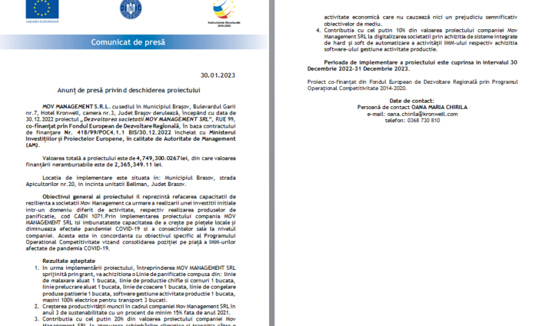 MOV MANAGEMENT S.R.L. cu sediul în Municipiul Braşov, Bulevardul Garii nr. 7, Hotel Kronwell, camera nr.3, Judet Braşov derulează, începând cu data de 30.12.2022 proiectul „ Dezvoltarea societatii MOV MANAGEMENT SRL”, RUE 99, co-finanţat prin Fondul European de Dezvoltare Regională, în baza contractului de finanţare Nr. 418/99/POC4.1.1 BIS/30.12.2022 încheiat cu Ministerul Investițiilor și Proiectelor Europene, în calitate de Autoritate de Management (AM).