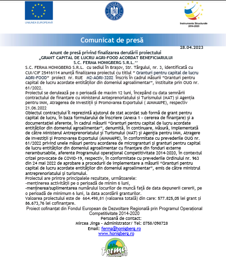 S.C. FERMA HONIGBERG S.R.L. cu sediul în Brașov, Str. Târgului, nr. 3, identificată cu CUI/CIF 25416114 anunță finalizarea proiectul cu titlul ” Granturi pentru capital de lucru AGRI-FOOD” proiect nr. RUE M2-AGRI-3202 înscris în cadrul Măsurii ”Granturi pentru capital de lucru acordate entităților din domeniul agroalimentar”, instituite prin OUG nr. 61/2022.