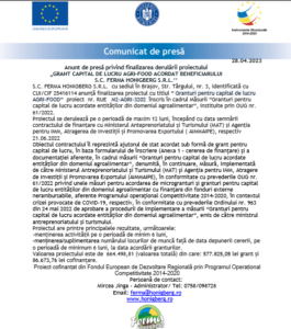Anunț de presă privind finalizarea derulării proiectului „GRANT CAPITAL DE LUCRU AGRI-FOOD ACORDAT BENEFICIARULUI S.C. FERMA HONIGBERG S.R.L.’’