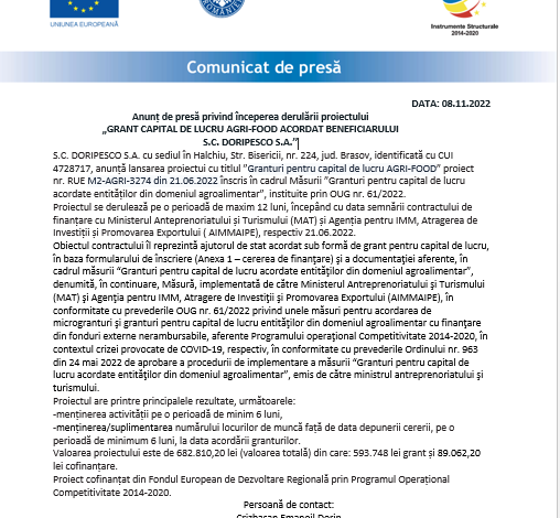 Anunț de presă privind începerea derulării proiectului „GRANT CAPITAL DE LUCRU AGRI-FOOD ACORDAT BENEFICIARULUI S.C. DORIPESCO S.A.’’