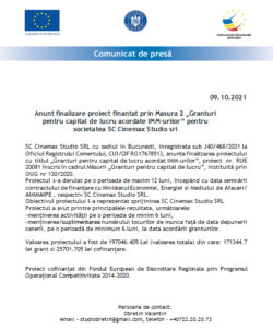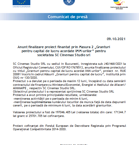 Anunț finalizare proiect finanțat prin Măsura 2 „Granturi pentru capital de lucru acordate IMM-urilor” pentru SC Cinemax Studio srl
