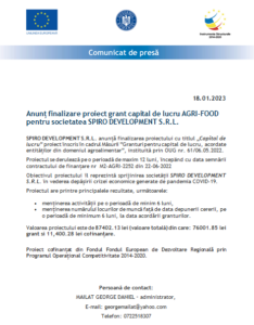 Anunț finalizare proiect grant capital de lucru AGRI-FOOD pentru societatea SPIRO DEVELOPMENT S.R.L.