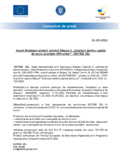 DISTRIB SRL, legal reprezentata prin Marinescu Bogdan Gabriel in calitate de administrator, identificata prin Cod unic RO7434210, inregistrata la Reg.Comertului sub Nr: J08/4302/1994, avand adresa in Brasov Str.Matei Corvin Nr.28 Cod 500449 anunță finalizarea proiectului cu titlul „M2 DISTRIB SRL”, proiect nr.RUE M2 -17537 înscris în cadrul Măsurii „Granturi pentru capital de lucru”, instituită prin OUG nr. 130/2020.