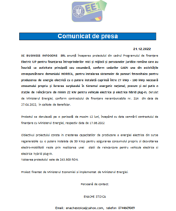 SC BUSINESS INFOCONS  SRL anunță începerea proiectului din cadrul Programului de finanțare Electric UP pentru finanțarea întreprinderilor mici și mijlocii și persoanelor juridice române care au înscrisă ca activitate principală sau secundară, conform codurilor CAEN una din activitățile corespunzătoare domeniului HORECA, pentru instalarea sistemelor de panouri fotovoltaice pentru producerea de energie electrică cu o putere instalată cuprinsă între 27 kWp – 100 kWp necesară consumului propriu și livrarea surplusului în Sistemul energetic național, precum și cel putin o stațiie de reîncărcare de minim 22 kW pentru vehicule electrice și electrice hibrid plug-in, derulat de Ministerul Energiei, conform contractului de finanțare nerambursabila nr. 214  din data de  27.04.2022,  în calitate de Beneficiar.