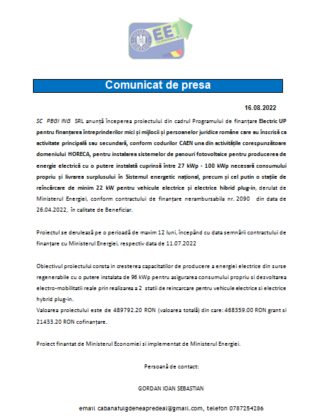 SC PBGI ING SRL anunță începerea proiectului din cadrul Programului de finanțare Electric UP pentru finanțarea întreprinderilor mici și mijlocii și persoanelor juridice române care au înscrisă ca activitate principală sau secundară, conform codurilor CAEN una din activitățile corespunzătoare domeniului HORECA, pentru instalarea sistemelor de panouri fotovoltaice pentru producerea de energie electrică cu o putere instalată cuprinsă între 27 kWp – 100 kWp necesară consumului propriu și livrarea surplusului în Sistemul energetic național, precum și cel putin o stațiie de reîncărcare de minim 22 kW pentru vehicule electrice și electrice hibrid plug-in, derulat de Ministerul Energiei, conform contractului de finanțare nerambursabila nr. 2090 din data de 26.04.2022, în calitate de Beneficiar.