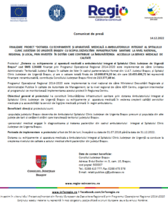 FINALIZARE PROIECT ”DOTAREA CU ECHIPAMENTE ȘI APARATURĂ MEDICALĂ A AMBULATORIULUI INTEGRAT AL SPITALULUI CLINIC JUDEȚEAN DE URGENȚĂ BRAȘOV CU SCOPUL DEZVOLTĂRII INFRASTRUCTURII SANITARE LA NIVEL NAȚIONAL, REGIONAL ȘI LOCAL, PRIN INVESTIȚII ÎN DOTĂRI CARE CONTRIBUIE LA ÎMBUNĂTĂȚIREA ACCESULUI LA SERVICII MEDICALE DE CALITATE