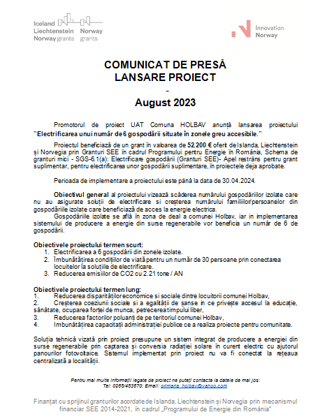 Promotorul de proiect UAT Comuna HOLBAV anunță lansarea proiectului ”Electrificarea unui număr de 6 gospodării situate în zonele greu accesibile.”