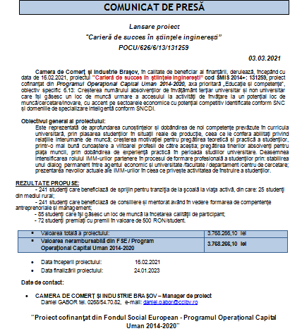 Camera de Comerț și Industrie Brașov, în calitate de beneficiar al finanțării, derulează, începând cu data de 16.02.2021, proiectul „Carieră de succes în științele inginerești” cod SMIS 2014+: 131259, proiect cofinanțat din Programul Operațional Capital Uman 2014-2020, axa prioritară „Educație și competențe”, obiectiv specific 6.13: Creșterea numărului absolvenților de învățământ terțiar universitar și non universitar care își găsesc un loc de muncă urmare a accesului la activități de învățare la un potențial loc de muncă/cercetare/inovare, cu accent pe sectoarele economice cu potențial competitiv identificate conform SNC și domeniile de specializare inteligentă conform SNCDI.