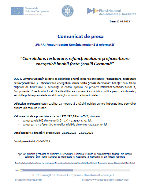 U.A.T. Comuna Vulcan în calitate de beneficiar anunță lansarea proiectului: ”Consolidare, restaurare, refuncționalizare şi  eficientizare energetică imobil fosta Şcoală Germană’’ finanțat prin Planul Național de Redresare și Reziliență în cadrul apelului de proiecte PNRR/2022/C10/I3 Runda 1, Componenta 10 — Fondul local I.3 – Reabilitarea moderată a clădirilor publice pentru a îmbunataţi serviciile publice prestate la nivelul unităţilor administrativ-teritoriale.