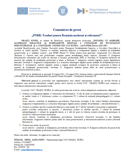 ORAȘUL RUPEA, în calitate de Beneficiar, anunță demararea proiectului „DOTAREA CU MOBILIER, MATERIALE DIDACTICE ȘI ECHIPAMENTE DIGITALE A UNITĂȚILOR DE ÎNVĂȚĂMÂNT PREUNIVERSITAR ȘI A UNITĂȚILOR CONEXE DIN UAT RUPEA”, cod F-PNRR-Dotari-2023-2097,