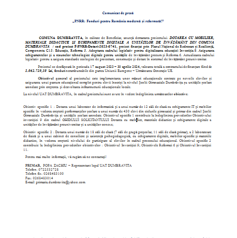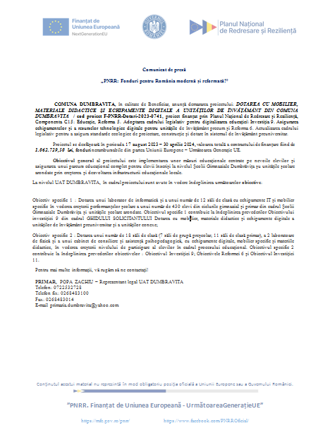 COMUNA DUMBRAVITA, în calitate de Beneficiar, anunță demararea proiectului: DOTAREA CU MOBILIER, MATERIALE DIDACTICE ȘI ECHIPAMENTE DIGITALE A UNITĂȚILOR DE ÎNVĂȚĂMÂNT DIN COMUNA DUMBRAVITA  / cod proiect F-PNRR-Dotari-2023-0741, proiect finanțat prin Planul Național de Redresare și Reziliență, Componenta C15: Educație, Reforma 5. Adoptarea cadrului legislativ pentru digitalizarea educației\ Investiția 9. Asigurarea echipamentelor și a resurselor tehnologice digitale pentru unitățile de învățământ precum și Reforma 6. Actualizarea cadrului legislativ pentru a asigura standarde ecologice de proiectare, construcție și dotare în sistemul de învățământ preuniversitar.