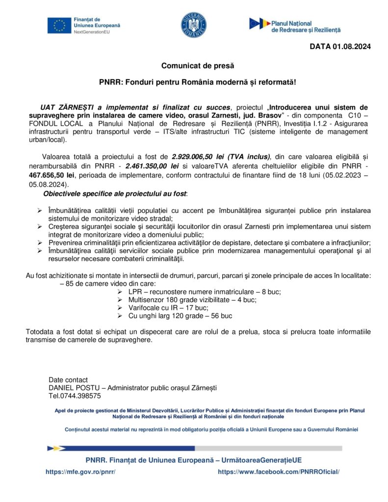 UAT ZĂRNEȘTI a implementat si finalizat cu succes, proiectul „Introducerea unui sistem de supraveghere prin instalarea de camere video, orasul Zarnesti, jud. Brasov” – din componenta C10 – FONDUL LOCAL a  Planului Național de  Redresare și Reziliență (PNRR), Investiția I.1.2 – Asigurarea infrastructurii pentru transportul verde – ITS/alte infrastructuri TIC (sisteme inteligente de management urban/local).