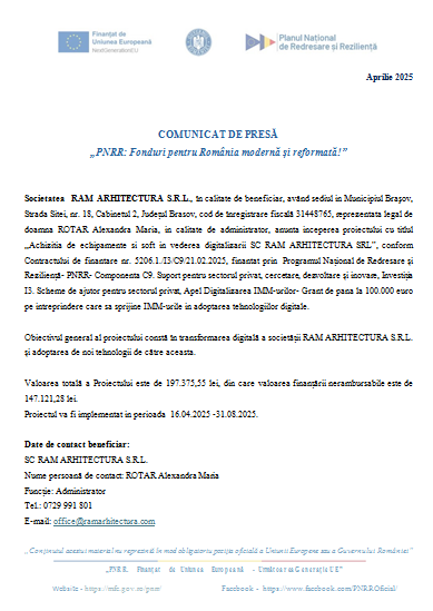 Societatea RAM ARHITECTURA S.R.L., în calitate de beneficiar, având sediul in Municipiul Braşov, Strada Sitei, nr. 18, Cabinetul 2, Județul Brasov, cod de înregistrare fiscală 31448765, reprezentata legal de doamna ROTAR Alexandra Maria, in calitate de administrator, anunta inceperea proiectului cu titlul ,,Achizitia de echipamente si soft in vederea digitalizarii SC RAM ARHITECTURA SRL”, conform Contractului de finantare nr. 5206.1./I3/C9/21.02.2025, finantat prin Programul Național de Redresare și Reziliență- PNRR- Componenta C9. Suport pentru sectorul privat, cercetare, dezvoltare și inovare, Investiția I3. Scheme de ajutor pentru sectorul privat, Apel Digitalizarea IMM-urilor- Grant de pana la 100.000 euro pe intreprindere care sa sprijine IMM-urile in adoptarea tehnologiilor digitale.