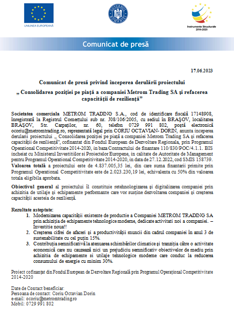 Societatea comerciala METROM TRADING S.A., cod de identificare fiscală 17148908, înregistrată la Registrul Comerțului sub nr. J08/106/2005, cu sediul în BRAŞOV, localitatea BRAȘOV, Str. Carpaților, nr. 60, telefon 0729 991 802, poștă electronică ocoriu@metromtrading.ro, reprezentată legal prin CORIU OCTAVIAN- DORIN, anunta inceperea derularii proiectului „Consolidarea poziției pe piață a companiei Metrom Trading SA și refacerea capacității de reziliență”, cofinantat din Fondul European de Dezvoltare Regionala, prin Programul Operational Competitivitate 2014-2020, in baza Contractului de finantare 110/830/POC/4.1.1. BIS incheiat cu Ministerul Investitiilor si Proiectelor Europene, in calitate de Autoritate de Management pentru Programul Operational Competitivitate 2014-2020, in data de 27.12.2022, cod SMIS 158739.