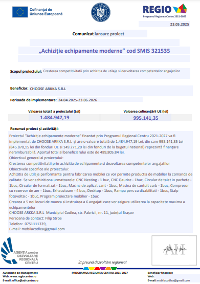 Proiectul “Achiziție echipamente moderne” finanțat prin Programul Regional Centru 2021-2027 va fi implementat de CHOOSE ARKKA S.R.L și are o valoare totală de 1.484.947,19 Lei, din care 995.141,35 Lei (845.870,15 lei din fonduri UE si 149.271,20 lei din fonduri de la bugetul național) reprezintă finanțare nerambursabilă. Aportul total al beneficiarului este de 489,805.84 lei.