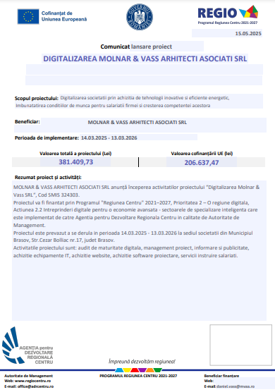 Comunicat lansare proiect DIGITALIZAREA MOLNAR & VASS ARHITECȚI ASOCIAȚI SRL