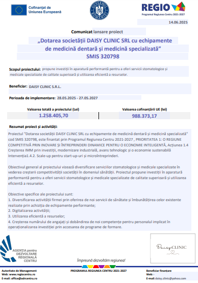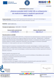 Comunicat lansare proiect „Dotarea societății DAISY CLINIC SRL cu echipamente de medicină dentară și medicină specializată”