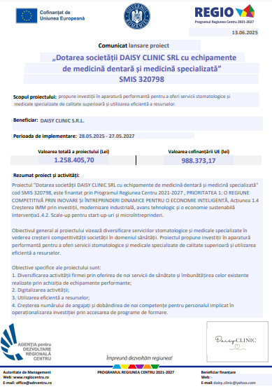 Comunicat lansare proiect „Dotarea societății DAISY CLINIC SRL cu echipamente de medicină dentară și medicină specializată”