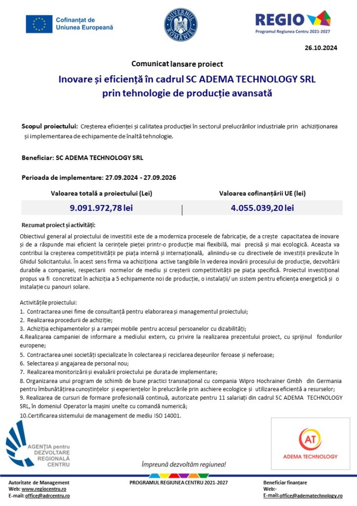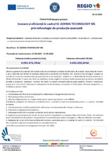 Comunicat lansare proiect – Inovare și eficiență în cadrul SC ADEMA TECHNOLOGY SRL prin tehnologie de producție avansată