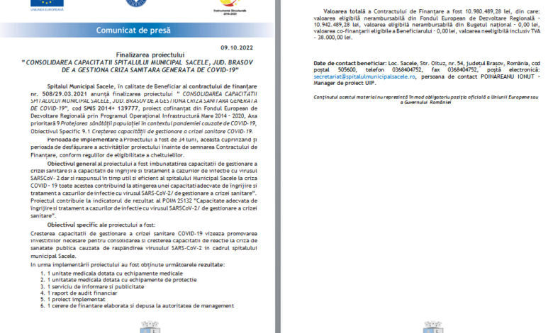 Finalizarea proiectului „CONSOLIDAREA CAPACITĂȚII SPITALULUI MUNICIPAL SĂCELE, JUD. BRAȘOV DE A GESTIONA CRIZA SANITARĂ GENERATĂ DE COVID-19