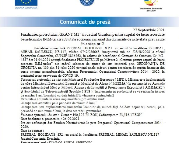 Societatea Comercială PREDEAL HOLIDAYS S.R.L. cu sediul în localitatea PREDEAL, MIHAIL SAULESCU, NR. 117, telefon 0742/086668, înregistrată sub nr. J08/58/2008 la oficiul Registrului Comerţului, CUI/CIF 3856262, în calitate de beneficiar al Contract de finanțare Nr. M2-4387 din 01.04.2021 anunţă finalizarea PROIECTULUI pe Măsura 2 „Granturipentru capital de lucru acordate IMM-urilor” din cadrul schemei de ajutor de stat instituită prin ORDONANŢA DE URGENŢĂ nr. 130 din 31 iulie 2020 privind unele măsuri pentru acordarea de sprijin financiar din surse externe nerambursabile, aferente Programului Operaţional Competitivitate 2014 – 2020, în contextul crizei provocate de COVID-19.