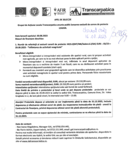 Data limită de primire a proiectelor şi locul unde se pot depune proiectele: proiectele se vor depune până la data de 29.09.2023 la sediul la sediul GAL Transcarpatica, Comuna Bran, Str. Valea Grajdului nr.2, de luni până vineri, în intervalul orar 9.00 – 13.00.