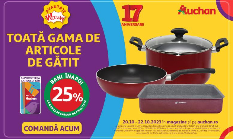 În plus, dacă ești membru MyCLUB Auchan, te bucuri de un beneficiu special: 25% bani înapoi ca bonus pe cardul de fidelitate la toată gama de articole de gătit. Până pe 24 octombrie ești așteptat în magazinele Auchan, precum și pe auchan.ro, să descoperi sute de oferte promoționale și beneficii speciale.