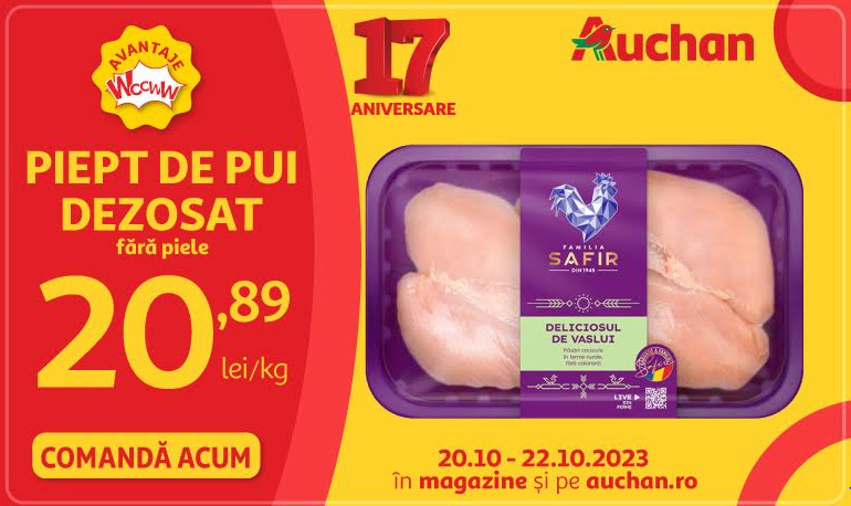 În perioada 20 – 22.10.2023, ai super preț la piept de pui dezosat fără piele: 20,89 lei/kg.