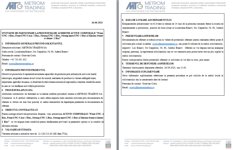Metrom Trading – INVITAȚIE DE PARTICIPARE LA PROCEDURA DE ACHIZIȚIE ACTIVE CORPORALE: „Freze CNC- 4 Buc, Freze CNC 5 Axe – 2 Buc, Strung CNC- 1 Buc, Strung mare CNC- 1 Buc și Mașină frezat și alezat- 1 Buc”