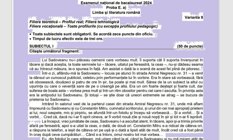 Astfel, la subiectul al III-lea, elevii de la real, tehnologic şi vocaţional (cu excepţia pedagogicului) au avut de redactat un eseu de minimum 400 de cuvinte, în care să prezinte particularitățile unui text dramatic studiat.