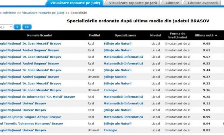 Primii admişi, cei şase cu media 10, sunt la Colegiul Naţional „Andrei Şaguna”, la CN Dr. Ioan Meşotă şi la CN „Radu Negru”, iar ultimul intrat are 2.55, fiind admis la Liceul „Şt. O. Iosif” din Rupea. De altfel, liceele de top din Braşov şi-au confirmat rangul, iar CN „Meşotă” a luat „spuma”, aici fiind admişi doar cei cu medii mult peste 9.00. Cele mai mari medii la Braşov au fost la profilurile Ştiinţele Naturii şi Matematică-Informatică. La Colegiul Naţional „Dr. Ioan Meşotă”, ultima medie la Ştiinţele Naturii a fost 9.68, la Matematică-Informatică a fost 9.57, iar la Filologie, ultima medie a fost 9.26. La Colegiul Naţional „Andrei Şaguna”, ultima medie la Ştiinţele Naturii a fost de 9.61, la Matematică-Informatică – 9.53, iar la Filologie 9.37. De altfel, cele două colegii centenare rivale îşi împart primele opt locuri – cinci „Meşotă” şi trei „Şaguna”. Totuşi, ultimul elev admis la „Şaguna”, Ştiinţele Naturii – bilingv franceză, are 8.71. Urmează Colegiul Naţional de Informatică „Grigore Moisil”, cu ultima medie 9.25. Note mari au fost şi la Colegiul Naţional „Unirea” unde la Matematică-Informatică ultima medie a fost 9.11, la Ştiinţele Naturii 9.09, iar la filologie 8,82. La