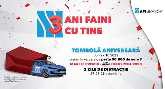 În luna octombrie, centrul comercial AFI Brașov sărbătorește 3 ani de shopping, evenimente și amintiri faine alături de brașoveni cu o TOMBOLĂ ANIVERSARĂ. Astfel, dacă faci shopping de minim 300 de lei din AFI Brașov în perioada 5 – 27 octombrie 2023 poți câștiga multe premii faine în valoare de peste 50.000 de euro, MARELE PREMIU fiind un FORD FOCUS MCA 2023. Talonul de tombolă se ridică în baza bonului de cumpărături din perioada campaniei, de la Info Desk-ul poziționat la intrarea din B-dul 15 Noiembrie 87. La tombolă se poate participa cu un singur talon pe zi și cu maxim cinci, pe toată perioada campaniei. Pentru a intra în posesia premiilor este necesară prezența fizică la EXTRAGEREA LIVE din data de 28 octombrie ora 16.00 ce va avea loc în esplanada de la etajul 1 din mall, zona foodcourt.