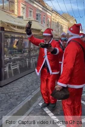 Grupul de bărbați puși pe distracție și colindat (îmbrăcați în costume de Moș Crăciun) a fost filmat la pe str. Republicii, unde, după cum se vede în imagini, au adus un pic de veselie în rândul trecătorilor și al angajaților de la terase și magazine.
