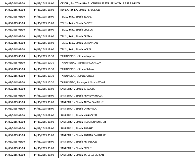Reprezentanţii Electrica Distribuţie Transilvania Sud anunţă că astăzi, 14 mai, se va întrerupe alimentarea cu energie electrică, pentru efectuarea de lucrări în instalațiile electrice, conform programului pe care îl găsiți în foto 2 și 3.
